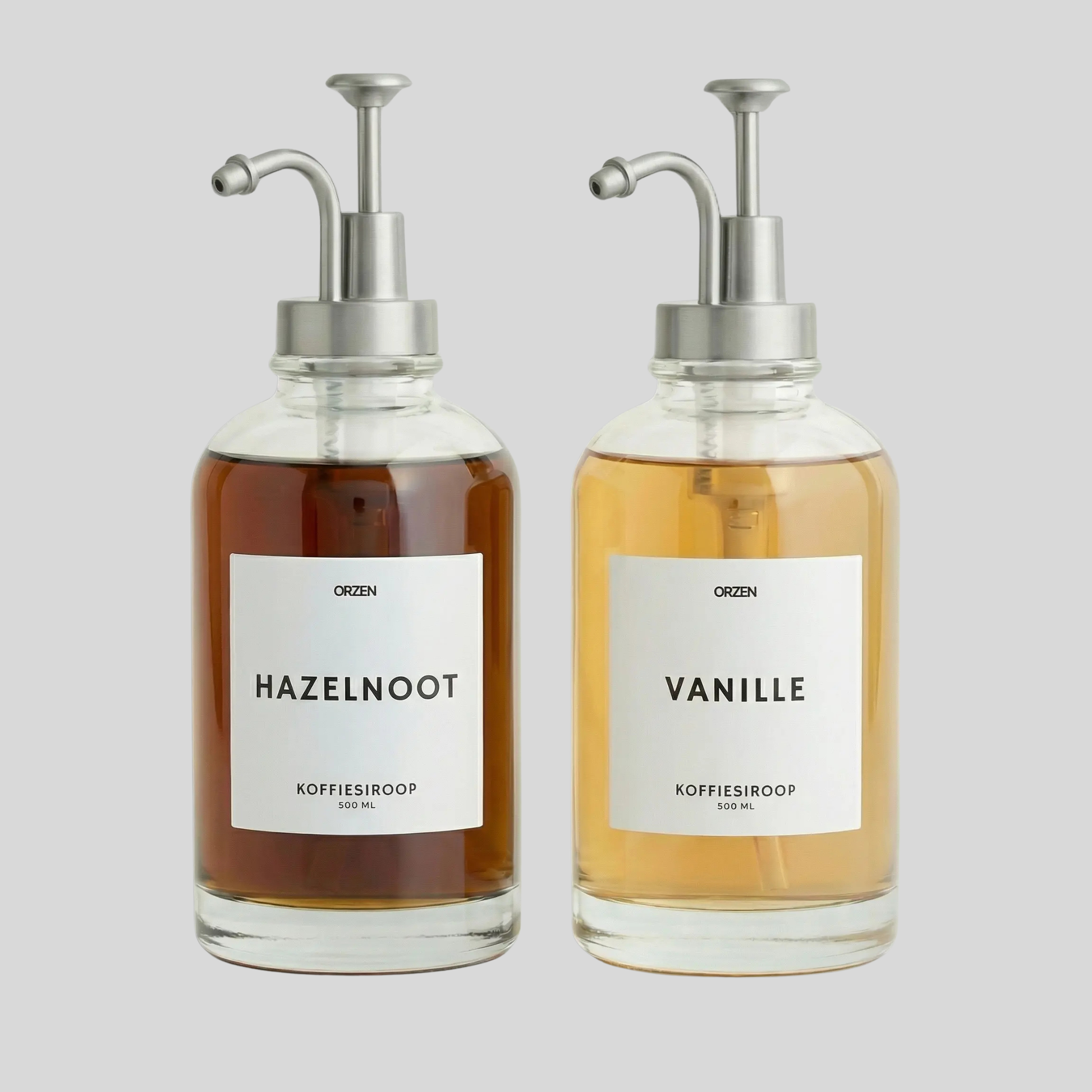 Koffiesiroop dispenser met Zilveren drukpomp – Luxe Set van 2 Glazen Flessen (500ml)