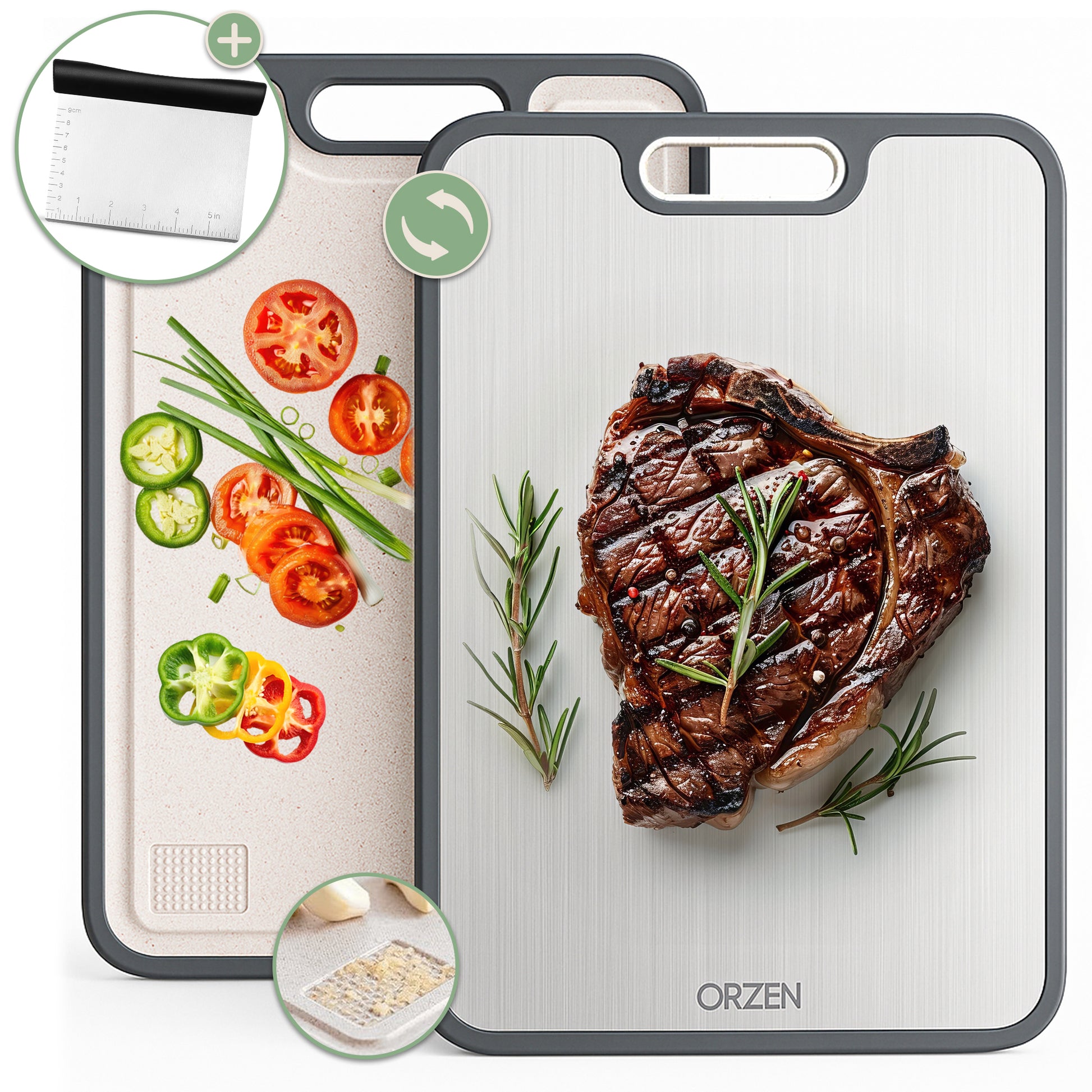 De Orzen titanium snijplank set biedt een hygiënische, duurzame oplossing voor het veilig bereiden van voedsel, met een antibacterieel titanium oppervlak en een slim dubbelzijdig ontwerp.