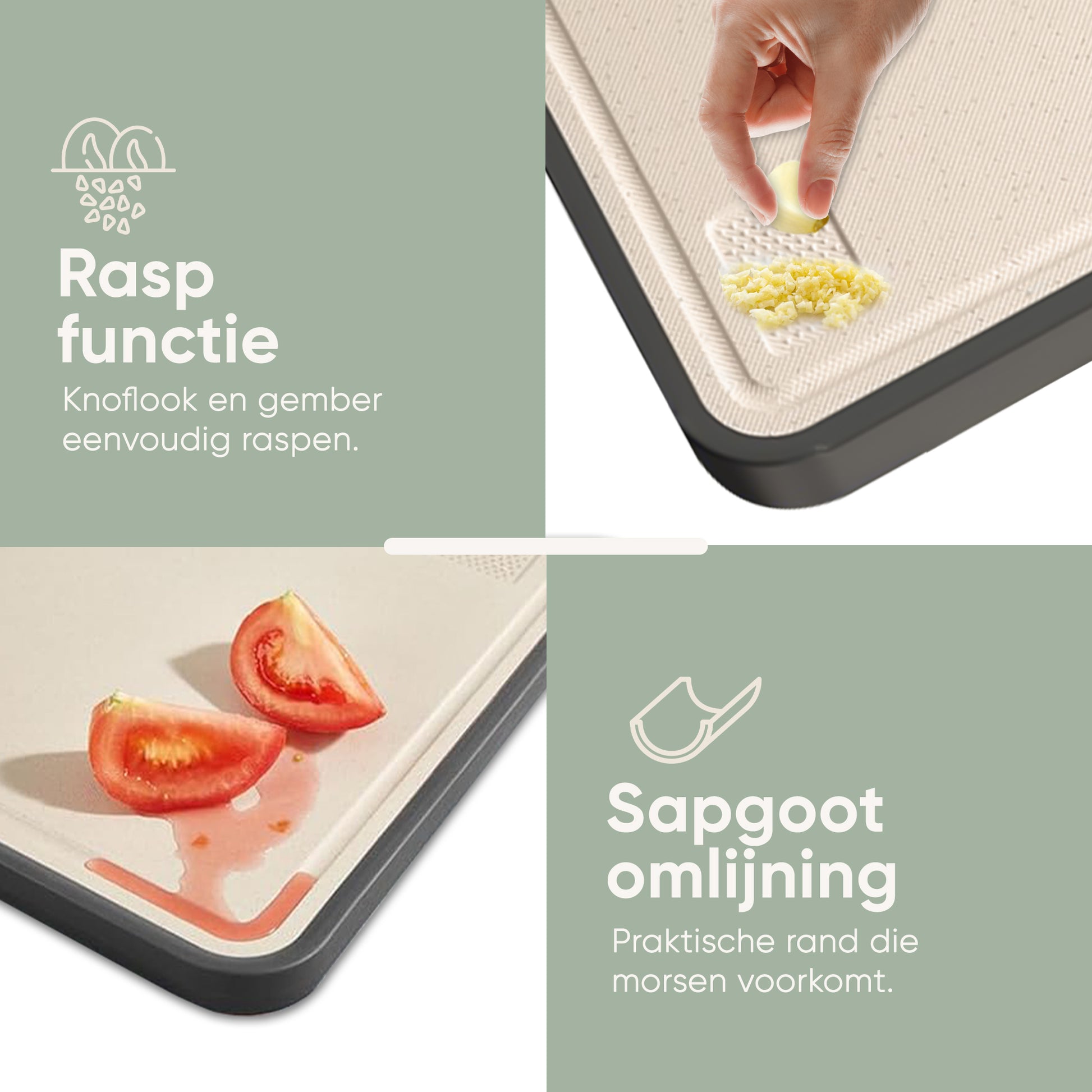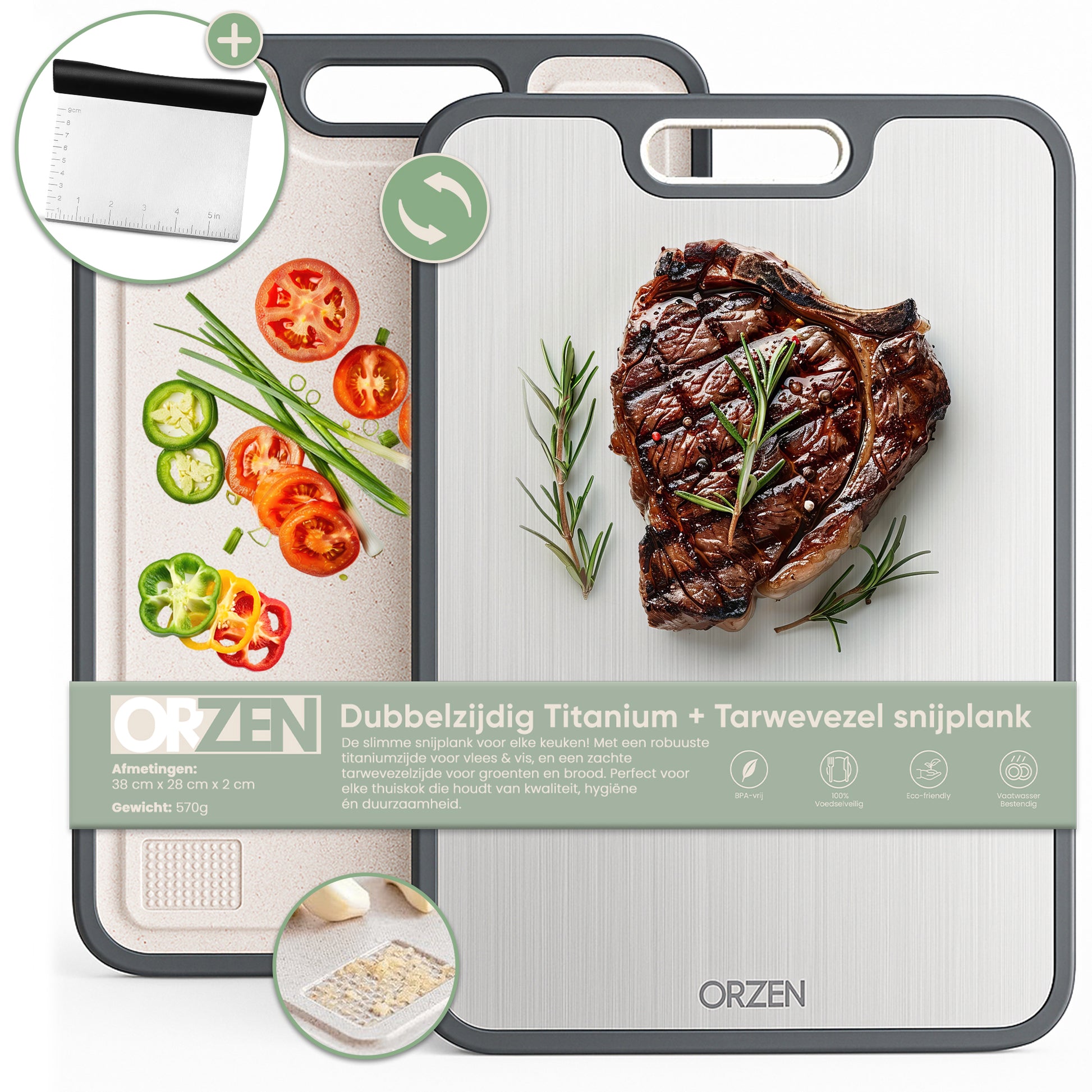 - Slim Dubbelzijdig Ontwerp: Gebruik de hygiënische titaniumzijde voor vlees & vis en de tarwevezelzijde voor groente & fruit.
